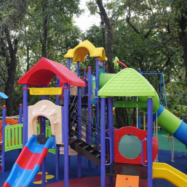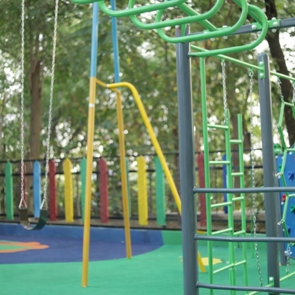 A prominent feature is a climbing structure with grey vertical poles and a green, hexagonal rope net for climbing. A green metal ladder is visible on the far left. In the background there are swings with metal chains and an A-frame support structure painted yellow and blue.