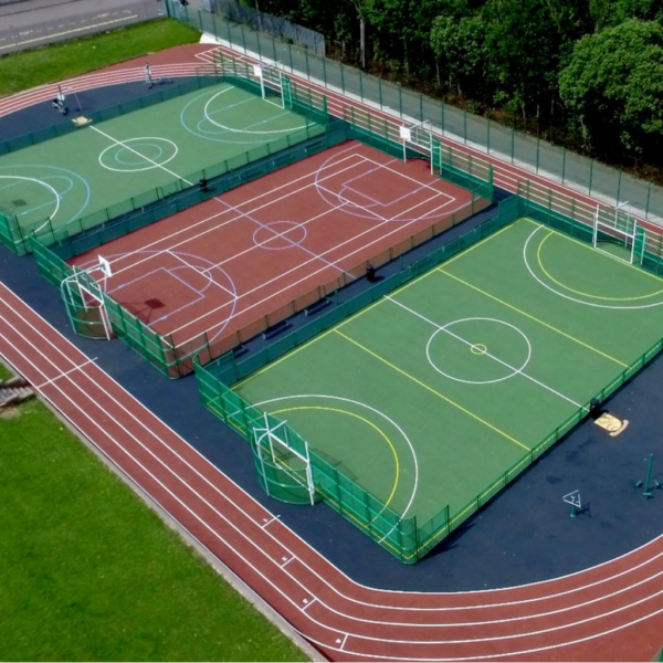 A fast-paced version of soccer played with fewer players on a smaller pitch, often using recessed goals built into the fencing.Played on the inner courts featuring backboards and hoops fixed to the perimeter fencing or freestanding posts.