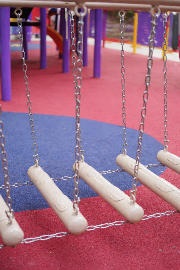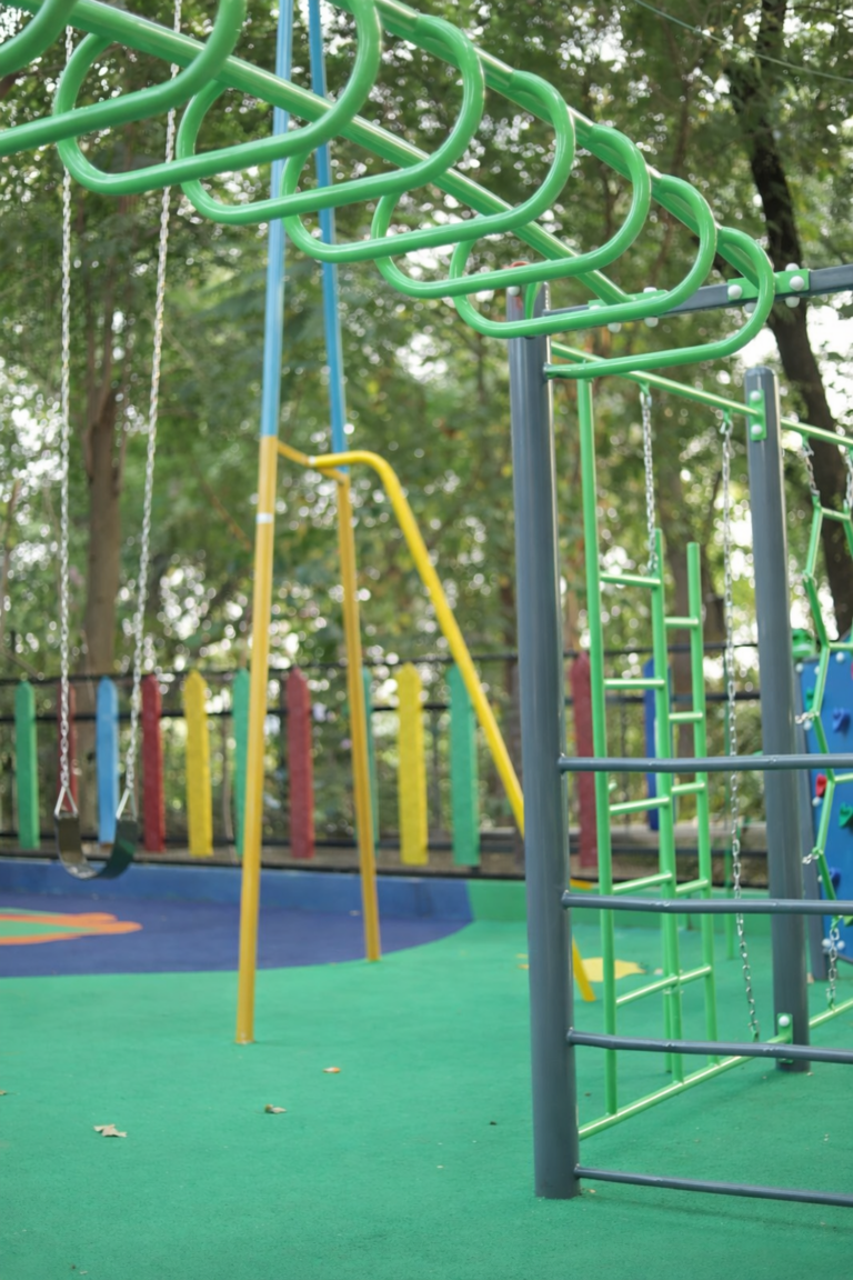 A colorful children’s playground featuring a safe bucket swing designed for toddlers.The play area is equipped with bright, engaging structures that encourage fun and learning.Soft rubber flooring ensures safety while…
